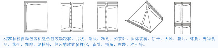 3220顆粒立式自動(dòng)包裝機(jī)使用變頻調(diào)速器,關(guān)閉機(jī)器時(shí)自動(dòng)打開(kāi)封刀,節(jié)省材料,單片機(jī)控制系統(tǒng),故障率低,制袋,填充,計(jì)量,封口,印刷,成品輸送一次性完成。是衡水包裝機(jī)械顆粒包裝的熱銷機(jī)器。包裝款式圖如下: