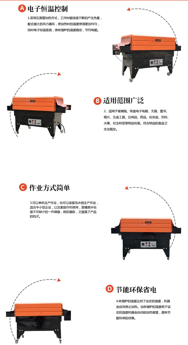 BS-4535熱收縮膜包裝機(jī)采用下循環(huán)式熱風(fēng)結(jié)構(gòu),爐道高度可自由可調(diào)節(jié),兩側(cè)百葉風(fēng)門可調(diào),配置智能溫控,交流調(diào)速,鐵氟籠傳送帶或滾筒式傳送帶,廣泛應(yīng)用于食品、日化、醫(yī)藥、機(jī)械等行業(yè),用于產(chǎn)品的單一、集合或組合包裝。包裝案例如下: