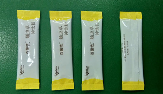 食用菌沖飲粉小袋包裝成品 食用菌沖飲粉包裝機(jī)設(shè)有自動打印批號或生產(chǎn)日期功能,包裝成品上切易撕口。食用菌固體沖飲粉自動包裝機(jī)的計量螺桿由步進(jìn)電機(jī)驅(qū)動可獲得極高的重復(fù)精度,生產(chǎn)材料全部選用不銹鋼制成,與物料接觸部位采用的是316不銹鋼,完全符合醫(yī)藥GMP要求。