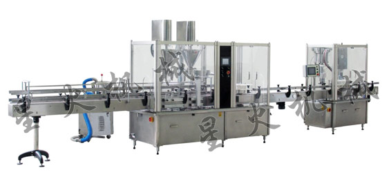粉末灌裝旋蓋流水線集粉末充填旋蓋、電磁感應(yīng)封口、雙面貼標(biāo)、噴碼等功能為一體,自動(dòng)完成粉末的充填包裝過程。該聯(lián)動(dòng)線為顆粒粉狀等物料自動(dòng)計(jì)量灌裝旋蓋貼標(biāo)流水線,具有自動(dòng)送罐、上料、計(jì)量、灌裝、旋蓋、封口、貼標(biāo)、噴印等功能。所有與物料接觸部分均為不銹鋼,整線由PLC控制,伺服電機(jī)計(jì)量,具有精度高、速度快、貼標(biāo)、噴碼清晰準(zhǔn)確等優(yōu)點(diǎn),適用于大多數(shù)粉末產(chǎn)品和特別產(chǎn)品的灌裝、旋蓋、貼標(biāo)等包裝.