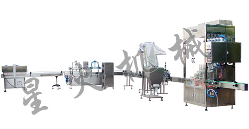 星火自動(dòng)化包裝肉醬流水線-醬料全自動(dòng)灌裝流水線主要由6頭灌裝機(jī),自動(dòng)下外蓋,壓旋式旋蓋機(jī),鋁箔封口機(jī),瓶口收縮機(jī)組成,形成一條完整的肉醬流水線。