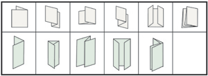 設(shè)計(jì)先進(jìn)、制造精良、可用于設(shè)計(jì)范圍內(nèi)各種不同尺寸和厚薄紙張的折疊、可折成圖例所示六種式樣。調(diào)整簡便,送紙流暢,無級(jí)調(diào)速,輕巧高效。